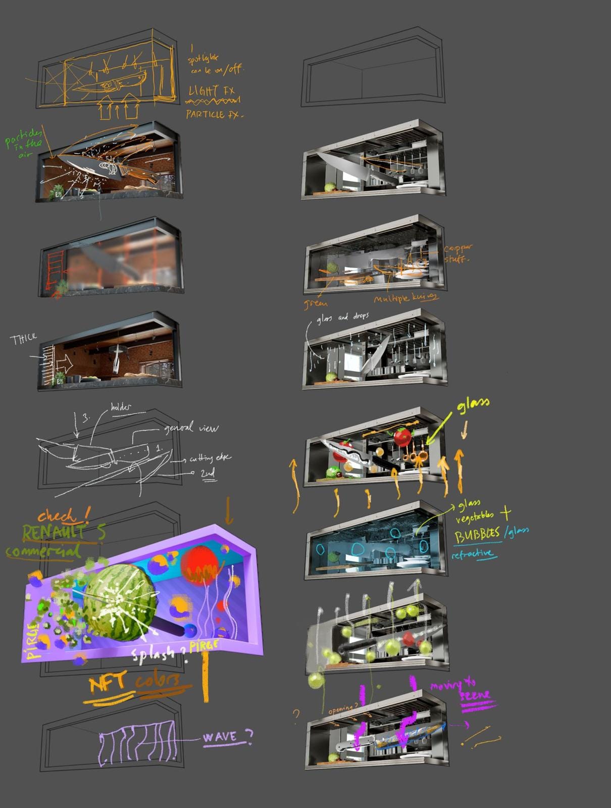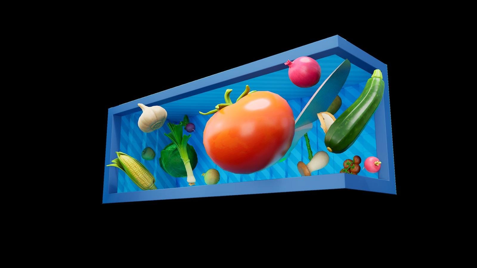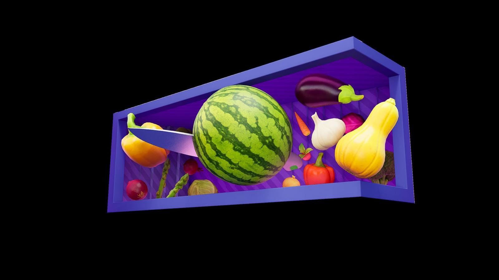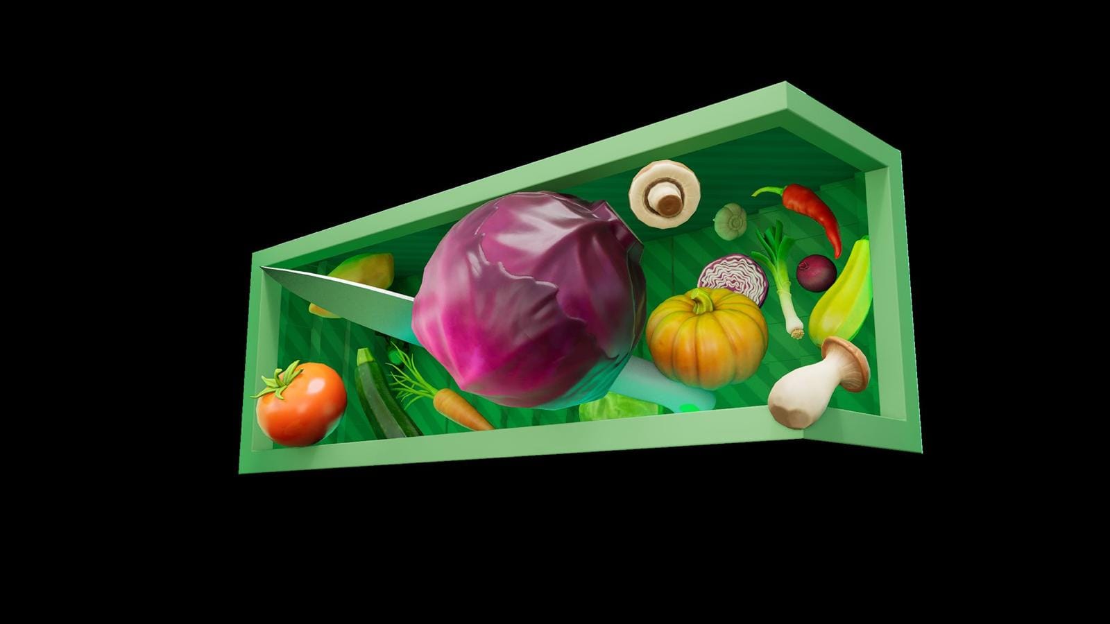 The installation features a series of dynamic 3D compositions, each bringing a Pirge knife to life as it cuts through a world of color and form. Vegetables and fruits explode into vibrant motion, caught in midair—an abstract celebration of culinary artistry. The knives themselves appear suspended in time, illuminated by the rhythmic dance of light and sound.